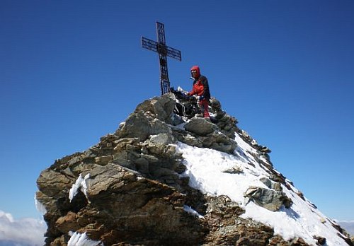 Ve 3 ráno se ozval budíček z mobilu. Já jsem na ten zvuk čekal hledíc do stropu už od půlnoci, kumpán Pavel si zkrátil čekání hlasitým chrápáním. Když otevřel mírně zpuchlá víčka, pronesl geniálně krátkou větu: „Tak co, jdem?“ Nabyl jsem silného dojmu, že kdybych odpověděl záporně, byl by schopen mi projevit dokonce i vděčnost. V hlavě se mi promítla celá půlroční příprava. Bylo rozhodnuto. „Jdem“. Spacáky jsme nechali na palandách, bágly vytáhli do „jídelny“, zhltli každý 1 tatranku, ústa a krky propláchli ledovcovou vodou, nasadili čelovky a vyrazili do mrazivé tmy. Hned nad chatou nad manipulační plošinou pro vrtulník narazíte na první fix. Visí přes asi dvoumetrový převis. Zde je dobré si dopředu promyslet, kam budete klást nohy, abyste se zbytečně nevysilovali šplháním po laně. Velkou věž obcházíte zprava, jsou tu opět fixní lana, i když nevím proč. Dál už je orientace ve tmě trochu složitější, tak se držte co nejvíc vlevo pod skalním hřebenem na italské straně. Vyskytují se tam borháky pro postupové jištění, ale nejspíš je neuvidíte, občas narazíte na fixní lano. Nám se podařilo sejít z cesty příliš vpravo do kamenitého svahu se sněhovými a ledovými plotnami, takže jsme čelovkami hledali v tomto terénu každou lidskou stopu. Až díky horolezcům, kteří vyšli z chaty půl hodiny po nás, nám došlo, že tudy cesta nevede. Pokud se budete držet pod hřebenem, narazíte na 30 m dlouhé Tyndallovo lano. Je zavěšeno ve skalním komínu a je tam dostatek stupů, takže jich při stoupání vzhůru využívejte (leze se nohama, ne rukama). Oproti italským horolezeckým kolegům jsme nevyhodnotili jako nutné se v tomto úseku jistit, protože se máte čeho držet. Toto vyhodnocení jsme při výstupu použili ještě mnohokrát, při slaňování na zpáteční cestě se mi ježily vlasy pod přílbou. Zdoláním Tyndallova lana se dostanete na hřeben. Zde se připravte, že končí idylické bezvětří a může nastat varianta dalšího postupu na sněhu a ledu (náš případ). Když jsem zde nasazoval mačky, vybavil se mi úryvek z článku o výstupu na Matterhorn Lvím hřebenem – mačky a cepín neberte, zbytečná zátěž.