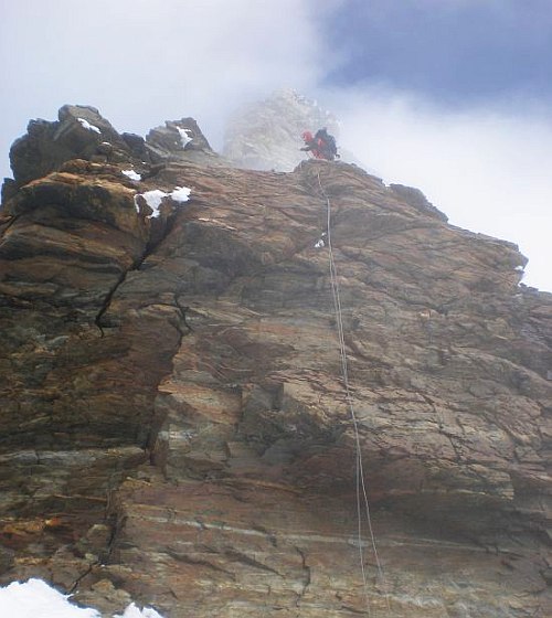 Zkouseli jsme to ve trech 2. zari a taky tam bylo dost snehu, takze macky a cepin se dost hodil. Vyrazili jsme dost brzy, ale kousek nad chatou jsme ztratili cestu a teprve az po rozedneni, jsme nasli nejaky retez, ktery vedl na hreben. Dosli jsme tedy jen na Tyndallovu vez a tam jsme si spocitali, ze pri nasi rychlosti postupu by nam to trvalo tam a zpet nejakych 22 hodin a za tmy jsme se rozhodne vracet nechteli. Podotykam, ze jsme se taky skoro vubec nejistili, abychom postup urychlili a ze mi z toho pri zpatecnim slanovani taky behal mraz po zadech. Bez lana, bychom ten sestup urcite nedali. A ve tme hledat ta slanovaci oka... Letos, kdyz uz tu cestu trochu zname, to snad vyjde. Ostatni fotky (bohuzel bez komentare) si muzete prohlednout na http://www.utko.feec.vutbr.cz/~cizr/matterhorn/.