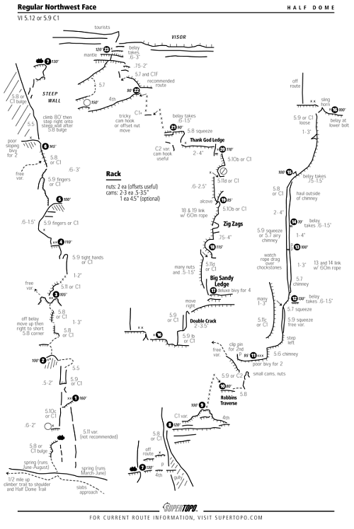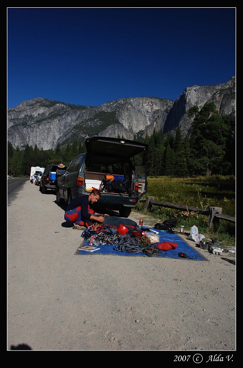 Konečně! Ve středu po práci sedáme do auta a razíme. Alda řídí, já ještě přišívám v ruce nosná ucha na naši půjčenou a podomácku upravovanou sviňu…Ráno po krátkém schrupnutí u jezera Tenaya následuje přesun do Curry village. Zde přebalujeme všechen matroš, jídlo a spaní, balíme a pomaloučku vyrážíme hledat nástup. Sviňa je pěkně těžká a jelikož jsme nějak pořádně nevyřešili její zádový systém, moje tělo trpí a vzpírá se. Obzvláště pak v plotnových pasážích s fixními lany. Za zmínku také stojí závěrečné suťové pole a husté křovisko…Vůbec celý nástup není zadarmo – 800m převýšení místy po pěšince, častěji však po kolenách v křoví, suti, jinde šplhání po fixních lanech po hladkých plotnách či volné přelezy až do 4.stupně a to vše s 20 až 30 kg na zádech…Naštěstí vodu s sebou většinou táhnout nemusíte, ani my jsme nemuseli, protože přímo pod nástupem jsou dva prameny – voda vytéká přímo ze skály. Jestli je alespoň jeden pramen živý je dobré zkontrolovat na www.supertopo.com . Nástup trvá asi 3 hodiny z Curry village. Nám se nástup velice zalíbil a tak jsme si jej druhý den ještě zopakovali, ale o tom až později.
