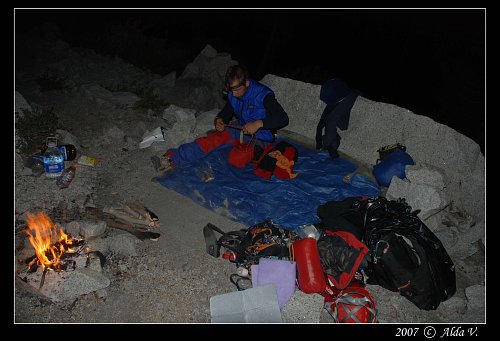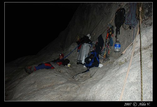Mají, jsme zachráněni. Teď už jde vše ráz na ráz. Slaňujeme, všechen materiál zůstává ve stěně – můžeme si to dovolit, jsme tu sami – a utíkáme dolů. Za hodinku a něco jsme v shopu a vybíráme sviňu. Vybrali jsme BD-70litrů za $140 a utíkáme zpátky pod nástup – už to známe, tak nám to trvá něco pod dvě hodinky. Přebalujeme sviňu a v 5 hodin začíná druhý pokus. Žumarujeme do 3. štandu, Alda tahá 4. délku a já už potmě další dvě. Ve 2:00 uleháme do spacáků na polici šestého štandu. Lezení celkem pohoda něco technicky – 4.délka je kousek hladká plotna ->nýtovačka, jinak klasický spárový lezení.