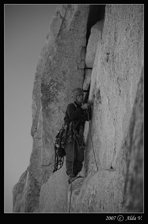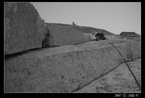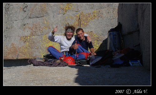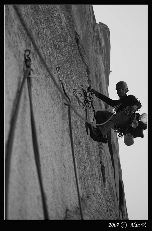 Probouzím se a koukám do 500m hluboké propasti. Ležím na třičtvrtě metru široké polici a pak už jen kolmá stěna dolů…Užívám si tyto pocity, ale ze spacáku se nechce – je docela kosa. Nicméně vylezu, snídáme a Alda je na řadě s nejtěžším úsekem cesty – Zig-Zag. Koutové lezení občas v převisu a pořád zleva doprava a zpátky – 3délky, střídáme se.