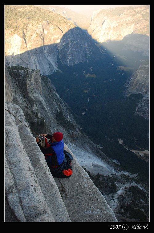 Spinkáme pěkně na rovné zemi ve spacáčku, ráno vstáváme, snídáme,… a já žumaraju první. Za sebou táhnu na jednom laně sviňu a po druhém žumaruje Alda. A teď se to stalo. Sviňu jsem vytáhl prvních asi dvacet metrů a ona se kousla pod převisem. Alda k ní po dlouhém přemlouvání dolézá – bál se prusíkovat na 7,8mm tenkém dvojčeti a já se mu vůbec nedivím – a hlásí mi že sviňa dalších dvacet jedna délek nevydrží, že už teď je pěkně prodřená. Nechci tomu věřit. Vzdát se kvůli svini?? Nikdy!! Posílám Aleškovi nemístné a pichlavé poznámky – doufám že mi promine - ale Co vytáhnu sviňu na štand přesvědčuji se, že je to v prd…Byl to totiž pouze nylonový pytel s téměř nulovou odolností proti oděru a my si mysleli, že to vydrží – nechtělo se nám utrácet… Ale co teď?! Trošku diskutujeme a navrhujeme různá řešení. Tlačí nás čas.Výstup je tak na 2-3 dny – spí se buď dole a pak na Big Sandy Ledge – 17.štand nebo ještě na 6. nebo 11.štandu, sestup po turistickém chodníku asi 9 mil, potom domů a v pondělí ráno do práce…Stihneme to?? Nakonec voláme ze služebního mobilu – ještě že jsme ho dostali – do Mountain shopu v Curry village jestli mají svině– číslo nacházíme v průvodci.