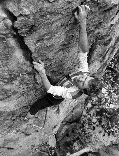 Dobové foto z cesty Údolní stěna, VIIc (RP IXa), leze Z. Petráň, 70.léta