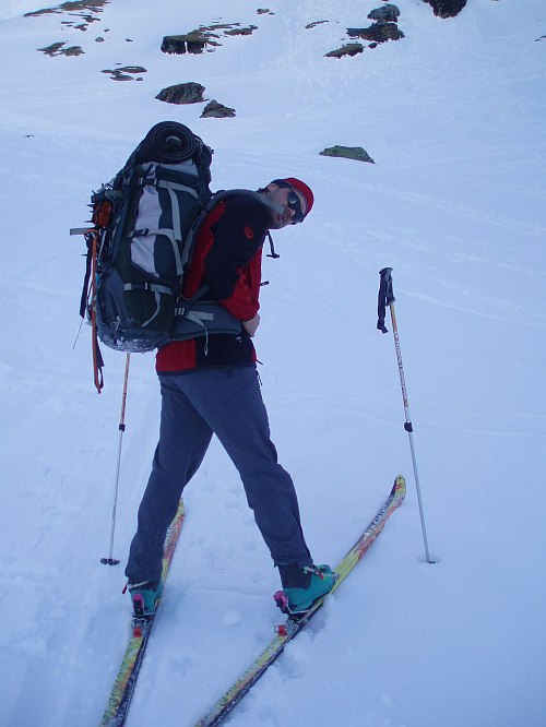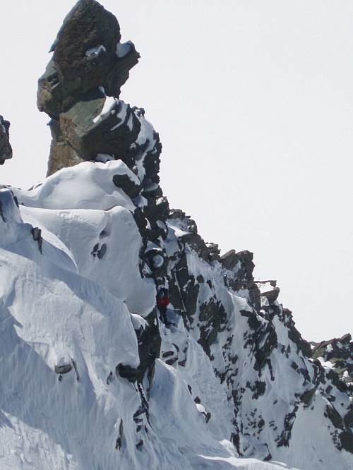 Nejvíc sil mi ale ubírá dvacetimetrový traverz strmým rozměklým sněhem a následující výlez na hřeben ve sněhu a sklonu stejné kvality. Aby to nebylo tak jednoduché, tak nás v tomto asi nejhorším místě hřebene (za našich podmínek) předbíhá Bimboška, při čemž ztrácíme asi hodinu času.