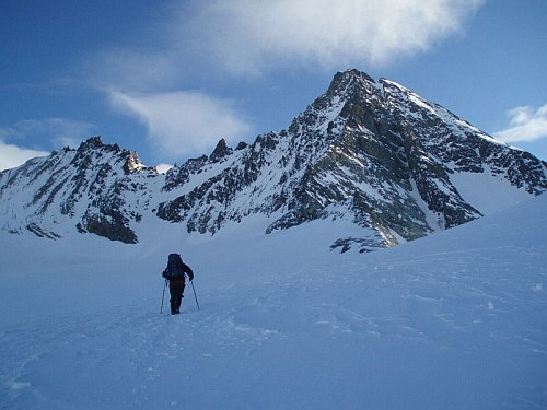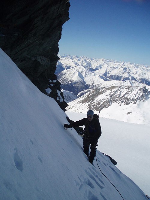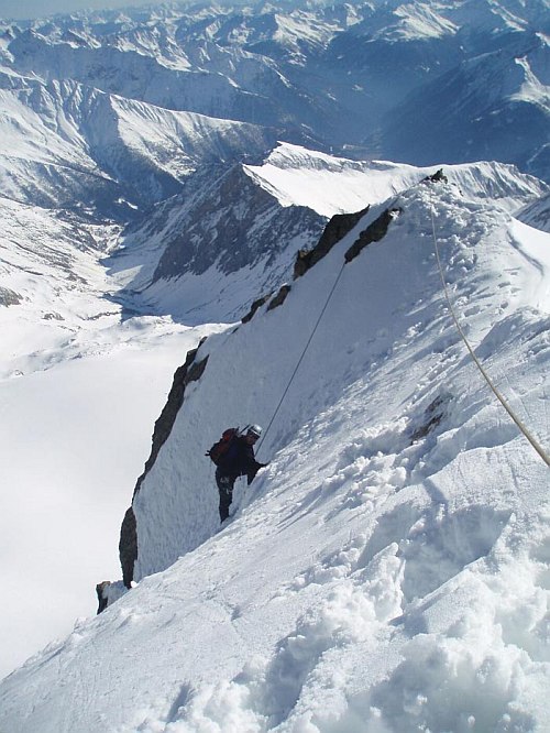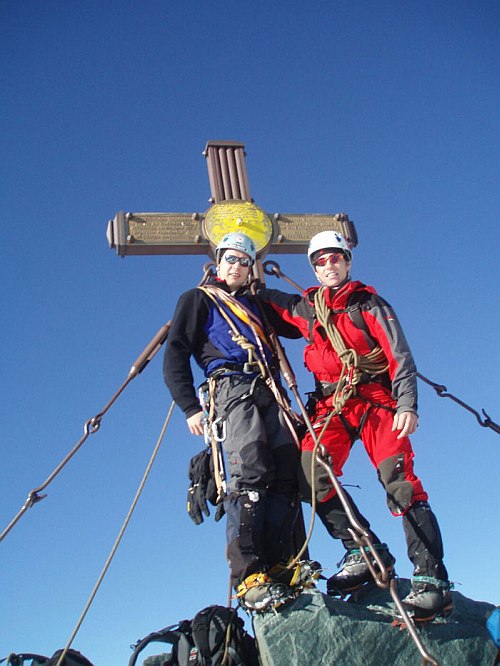 Následuje už v celku pohodový dolez na vrchol. Jen už nám moc nestačí dech, takže krátké pauzy na sebe nenechají dlouho čekat. Jedna aklimatizační túra na lyžích by asi nebyla na škodu, i když vrchol má jen necelých 3800. Na vrcholu si třeseme pravicemi ve čtyřech-v podstatě společně dolézáme i s Bimboškou a Jardou. Teď už ale definitivně dostáváme strach o Vendu s Alešem, které jsme od Frühstückplatzu nikdo nezahlédli. Nemáme jim jak pomoci, tak se navzájem fotíme a sestupujeme a slaňujeme do sedýlka mezi Grossglocknerem a Kleinglocknerem.