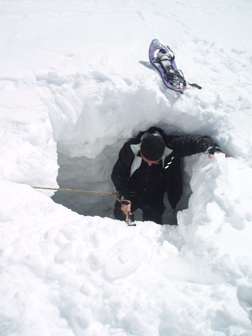 Sestup už je na pohodu, jistíme se přes tyče na hřebeni a za chvíli jsme na Johann hutte, kde nás očekává Bimboš, který tam nocuje s druhou půlkou naší party. Dává nám napít čaje, cpeme do sebe trochu sušenek a mastíme po ferrátce dolů na ledovec a po něm při zapadajícím slunci zpátky na Stüdlhütte. Tam lehce zapíjíme úspěch a brzo usínáme. Stále bez Aleše a Vendy. Ti dorážejí ve dvě ráno s čelovkama-otočili to ještě před Frühstückplatzem a slaňovali po hřebeni zpátky. Proč jim to trvalo tak dlouho, na to sem se jich ještě nestačil zeptat. Ráno mě bolí celý člověk, ale přibalujem do baťůžku sondu a lopatu, zapínáme pípáky a jdeme se ještě protáhnout na Romariswandkopf. Kousek nad chatou mi na zádech pípá esemeska. Píše Aleš, který pod nástupem do Stüdlgratu hledá rukavice, které jim předchozí den spadly z hřebene. Píše: „Ahoj, jedna zenska spadla do trhliny v Teufelskamp, nemate tam cestu? Nema lano, potrebuje vytahnout! Ales“ Odepisuju, že si uděláme cestu a šviháme jak můžeme směrem k Teufelskamp.