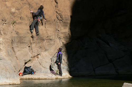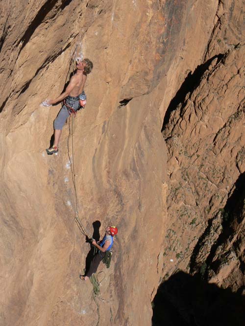 Další den jsme to rozjeli. Jako první se do stěny pustila fréza na nýty Tomajda. Celkem dost zajímavé bylo to, že jsme poprvé nastupovali cestu téměř z vodní hladiny. Celkem zajímavá situace nastala, když nám spadl do vody vrták. Naštěstí to zachránil Jíra a ochotně se pro něj v trenkách ponořil. Během pěti dnů jsme prostoupili touto krásnou a náročnou stěnou zvanou „Plage Mansour“ . Ve stěně vedly pouze nějaké nelezené hákovačky, takže jsme zde měli první volně "lezenou".