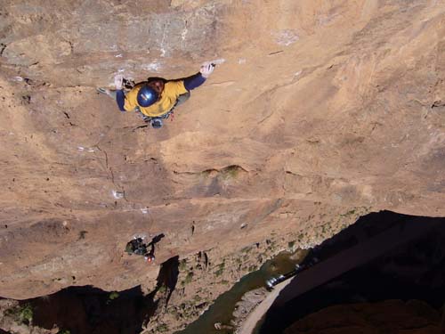 Po příletu do Marakéše jsme osedlali místní autobusovou linku. Během 8 hodinové cesty přes pohoří Atlas jsme se večer ocitli v posledním městě před Todrou v Tiniri. Posledních 15 km jsme jeli taxíkem. Ihned po příjezdu nás ohromil vstup do soutěsky. 300m stěny zde svírají úzký kaňon, kterým protéká čirá říčka Todra. Jelikož jsme sem nepřijeli pouze očumovat přírodní krásy, ale natlouct další DZC cestu, tak jsme hned druhý den vyjeli půjčeným autem na průzkum údolí. Po půl denním výletu jsme usoudili, že ta nej pecka bude ihned při vstupu do soutěsky. Je to krásná stěna, s viditelnou těžkou a převislou horní pasáží a ještě k tomu kousíček od hotelu. Bylo jasno.