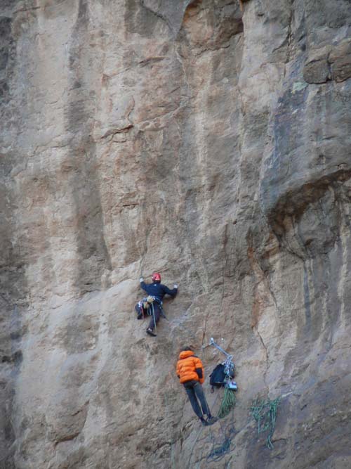Lezení po místním vápenci bylo hodně různorodé. Většinou po lištách, v pevné hnědé skále. Klíčovou pasáží se nakonec ukázala opravdu vrchní část stěny, kde jsme prolezli krásnou jasnou linii s délkami 7b+, 8a, 8a. Jinak cesta má 6 délek o 275 metrech. Povedlo se nám tak, udělat pravděpodobně první českou cestu v oblasti a jednu z nejtěžších a nejdelších. Nakonec přišlo na řadu vymyslet nějaký název.