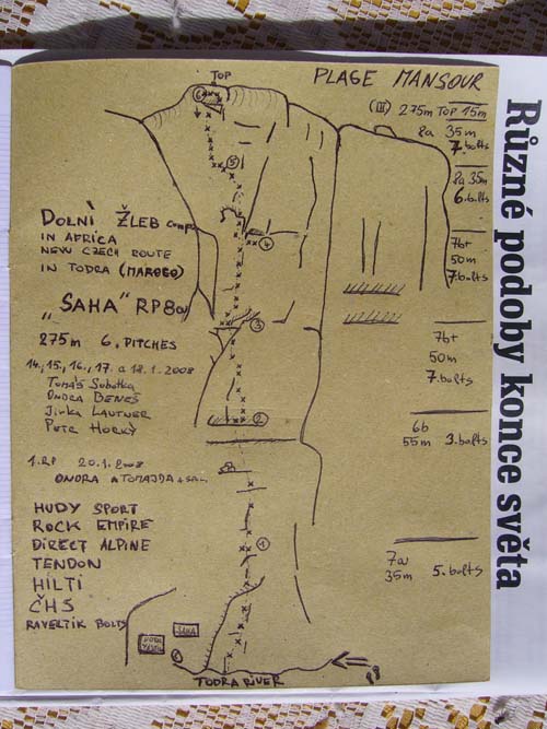 ( hotel , kde jsme bydleli), ale to nebylo přesně to, co jsme hledali. Nakonec padlo rozhodnutí pro název SAHA, je to místní berberskou řečí děkuji. Ten dík patřil samozřejmě za to,  že jsme zde  tuto cestu mohli udělat, ale i za to že jsme si to v Todře doposavad pořádně užili. Pokud by měl někdo zájem tuto cestu přelézt, tak mu stačí pár friendů, expresky a 2x 60m lana. Poslední prací ve stěně bylo vyfotit a natočit poslední zbývající záběry a dále si užívat již existujícího lezení v Todře.