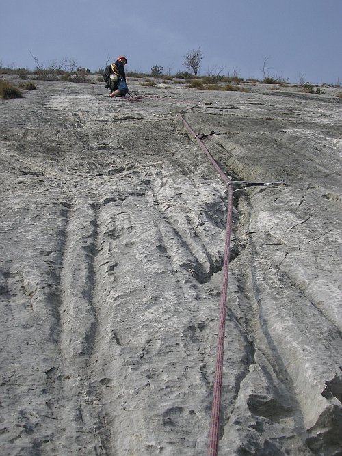 Díky oblibě ploten je mnoho cest dost oklouzaných. Proto doporučuji vynechat cesty 1 až 8 a věnovat se delším cestám v pravé části stěny. Za víkend jsme s Marťasem zvládli na pohodu 3 cetsy a všechny mohu doporučit. Č14 Gabri Camila 300m, 9 délek, 6b, č.18 Teresa 400m, 15 délek 5c a Claudia 400m, 14 délek, 5a. Pěkný holky.