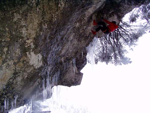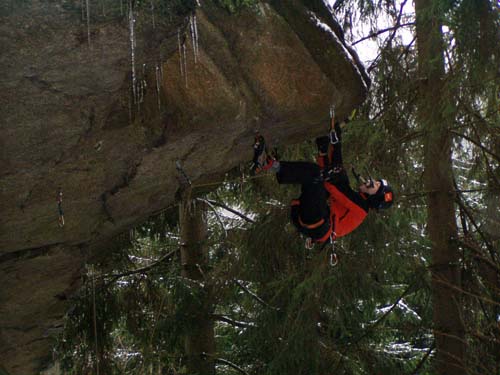 V oblasti Krkavka, kde najdete 20-25metrů převislého super lezení v rozbité a štípající se skále s možností zaseknutí za příznivých podmínek i do ledu jsme přelezli také pár cest.