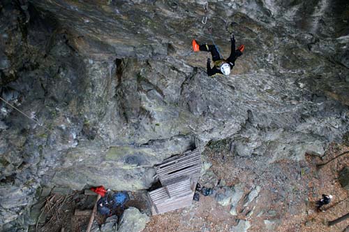 Převislá vytrvalostní cesta s dlouhými tahy a nepříjemným přelezem hrany patří mezi nejnovější v oblasti. Sám autor Albert Leichtfried (s kterým jsme tu strávili jeden den lezení) nás ujistil v tvrzení, že čím novější cesta, tím tvrdší klasifikace (jako u nás :). Luba tuto cestu v 45° sklonu po malých dírkách, s pěknými nátahy přelezl. Má snaha tuto pro mě vytrvalostní cestu vylézt, byla marná. Ve třetím nalezení do cesty, jsem vymyslela jak vylézt bouldrový přelez hrany, do kterého ale dojdeš už s pořádnými "bandaskami".