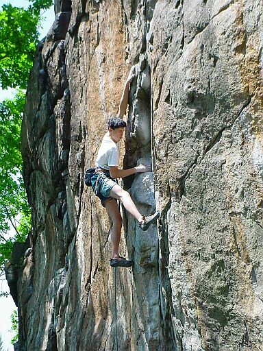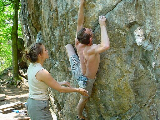 Ve skalách nás přivítala celkem slušná skupinka plzeňáků, bohužel chyběli Martin se Štěpánem, užívající si předmaturitního stresu. Pro seznámení se s klasifikací jsme nejdřív vylezli pár lehčích cest (dvě) a potom i traverz „Roll over it“. Pak přišel čas vyzkoušet nějaké projekty. Nejprve ten vpravo od „Nového koření“ a potom napřímení „Obladi oblada“. Pražící slunce ale nebylo zrovna nakloněno přílišným výkonům a tak mi v obou projektech zůstalo k dořešení po jednom kroku. Vedra, které lezení téměř znemožňovalo, jsme s naturalizovaným slovenským plzeňákem Markem Leitmanem využili k vymýšlení různých kombinací. Podařilo se nám teoreticky propojit cestu celou stěnou, ale možná to byl jenom úpal J. Nicméně Marek přelezl kombinaci „Lídy“ a „Čáry života“ (lezenou zřejmě už dříve), kterou jsme si pracovně pojmenovali „Lídina čárka“ s klasifikací kolem 9. Pak už mi nezbylo než čekat až se co nejvíce ochladí, abych mohl zkusit další z místních top cest – „Zlaté koule“. Čekání se vyplatilo a s přicházející tmou jsem zaznamenal jejich OS.