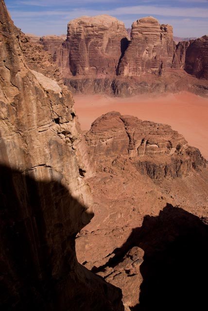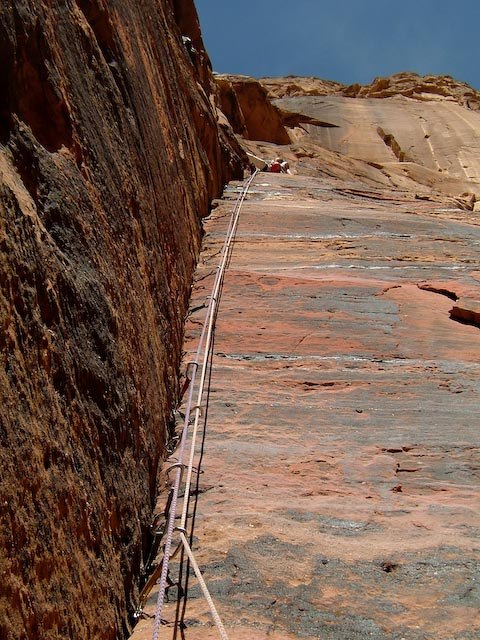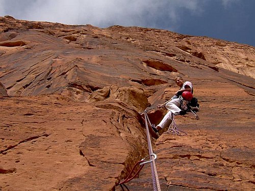 Druhý lezecký den zkoušíme něco pořádného. Towering Inferno (5+, 6b, 6a, 6b A1, 6a, 5+ A2, 4) na East Dome of Jebel Rum, název trošku napovídá, o co půjde. Samá spárka, od prstové po žábovici. Délka 6b A1 je mimořádně těžká, je to olámaný mírně převislý oblý sokolíček, který se vůbec nedá chytnout vyjma dvouprstové 1cm hluboké dírky, k tomu nic na nohy. Průvodce píše, ať vezmem do této cesty 25 skob, já nemám ani jednu, tak si stoupám do založeného uzlíku, pak do nejmenšího vklíněnce, nakonec do trhlinky zakládám i šťárátko pro případ připoodsednutí si a na pokraji pěkné tlamy to dolézám čistě. V délce 5+ A2 se situace opakuje. Jeden 7mm uzlík, druhý 4mm uzlík na jednoducho (nechápu, jak v tom převislém sokolíčku drží), nohy na tření, vysoký krok k prsům na osolený čudlík, šílený natahovák do osolené obliny, kus sokolíka ulamuji, skorotlama, ale dávám to. Uff. Skoby by se asi hodily. Kačka to jumaruje.