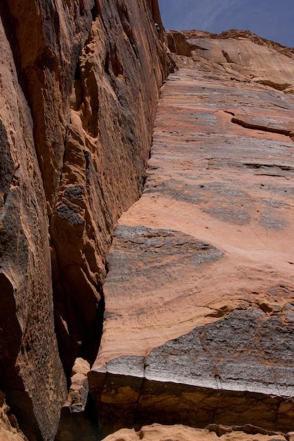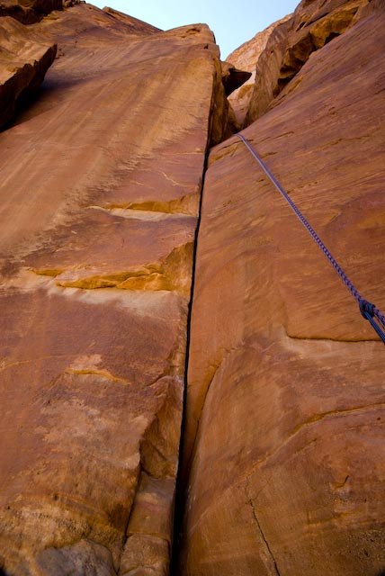 Pátý den odpoledne lezeme Catfish Corner (6a+, 6c, 6a) na Jebel Um Ishrin. Průvodce píše "výborně zajištěno", což v praxi znamená, že to jde výborně zajistit vlastními prostředky. V první délce zajímavý výhlemz ze spárokomína přes převísek, no a pak úžasná sokolíkovitá prstová trhlina s nohama na tření.