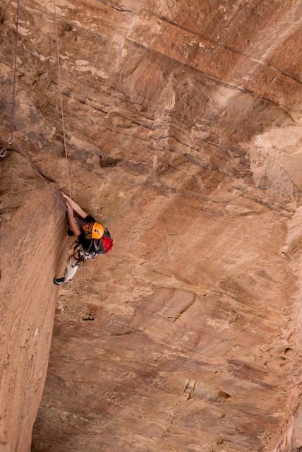 Šestý den lezeme opět něco pořádného. Lionheart (4, 6a, 6b, 6a, 6a, 6b, 6a, 4) na Abu Aina Towers. Vyjma první a poslední délky je to šestidélková poctivá spára, sympatická je vyrovnaná obtížnost délek (žádné ulejvání), bohužel písek tu na místní poměry trochu více solí a láme se, ovšem stále se to nedá srovnat s Příhrazskou strouhankou či Hruboskalskými solivary. Kačka je moc unavená, poslední délky trochu hákuje.