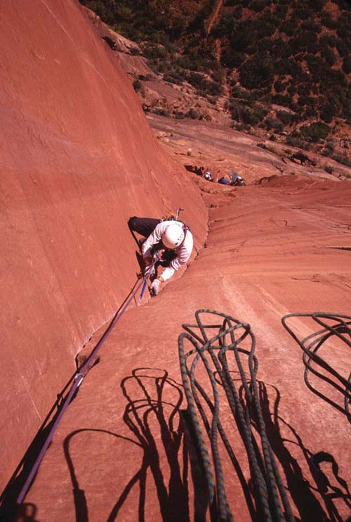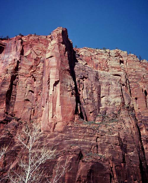 Moonlight Buttress, Zion, Utah. Cesta vede středem ve výrazném pilíře