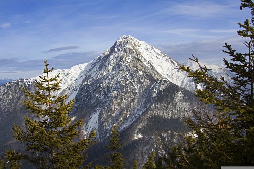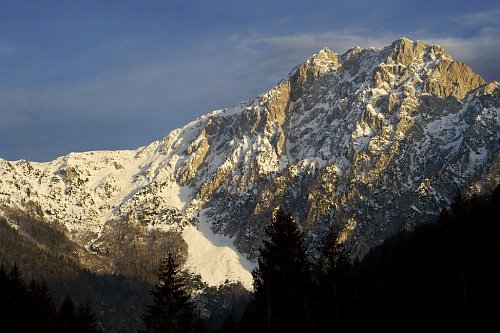 Storžič z údolí při odjezdu (severní tvar), vlevo hřeben Skarjev rob