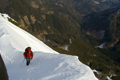 Ráno se nám jako vždy po nočním kuropění vstávat nechtělo, ale kolem sedmé u snídaně před chatou pozorujeme alpinisty stoupající severním kotlem, který ve své horní části přechází přímo do severní stěny. Sklidili si náš obdiv aniž bychom tušili co jsme si vybrali za cestu my. Již název Škarjev rob, jak se severní hřeben jmenuje, není přitažlivý název, nicméně se nám zdál jako "mapová normálka" ideální. V lese nad chatou s rozpaky opouštíme vyšlapanou stezku vedoucí do severního vysněženého kotle a dále již sólo pokračujeme podél značení směrem k hřebeni. Ve svém konci již dost strmě za nepříjemného boření se v zasněžené kleči. Zhruba po hodině a půl dosahujeme hřebene a po pohledu na něj nám není zrovna do zpěvu. Délka i expozice sněhové, místy skalnaté hrany je odstrašující. Dáváme se do pochodu, nejprve opět nepříjemným pásmem klečí, později přecházíme na sněhovou hranu, která je místy ostrá jak nůž. Přímo po jejím ostří, někdy traversem kvůli převějím postupujeme pod první výrazný hrb v hřebeni. Zde nasazujeme mačky, protože sním se výškou mění ve firn a postup bez nich by se stal riskantním. Překonáváme strmý hank a ještě ostřejší hranou mixovanou balvany docházíme k poslední, nejhorší části hřebene. Jedná se o posněžené skalky, které se nedají obejít a musí se překonat přímo. V létě tudy vede zajištěná cesta a jistě to není problém, ale v únoru, byť je relativně málo sněhu (50 cm), je to problém no. 1. Dva ze skupiny vzdávají přechod pro svou nebezpečnost, dva se vydáváme vzhůru. Hrana je tak ostrá a strmá, že jí nelze traversovat ani po ní jít. Musíme tedy místy rozkročmo překonat delikátnější pasáže. Přelézáme (II.UIAA) několik skalních bloků a opět rozkrok. Takto se velmi pomalu v úžasné expozici došouráme na konec hřebínku do jakéhosi úzkého sedla. Následuje travers firnem do nejvrchnější části severní stěny na vyšlapanou stopu. Úleva je značná. Toto se již zdá jako procházka. Po vydupaných schodech vycházíme vyčerpaní na vrchol k dřevěnému kříži. Slunce silně hřeje a my toho využíváme k odpočinku a regeneraci vydaných sil pro sestup. Ten vedeme již vyšlapanou cestou, která nám odspoda nevoněla pro svou zdánlivou komplikovanost. Při sestupu se ukázalo, že opak je pravdou a v zimě se jedná pravděpodobně o nejednodušší cestu na vrchol. Sestupujeme k chatě, kde nás již nedočkavě vyhlížejí kolegové. Patří jim můj dík, protože bez jejich podpory ve výstupu na hřeben, kdy nám ušetřili síly prošlapováním, by bylo dosažení vrcholu krajně nejisté.