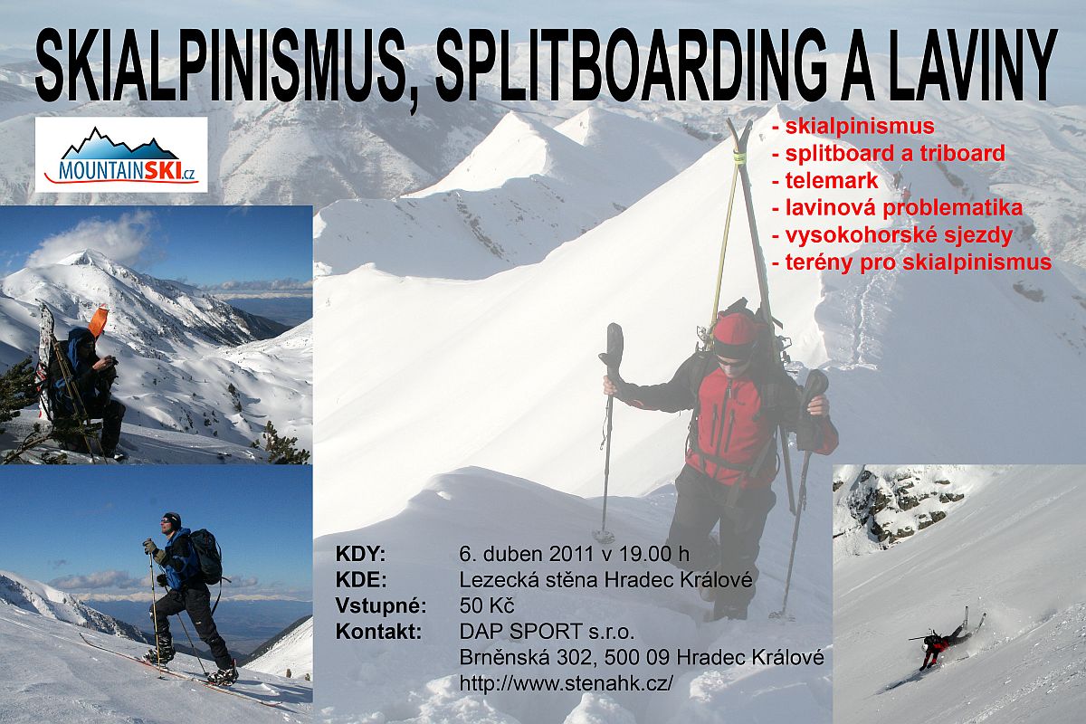 Povypráví Vám nejen o pobytu v horách, technikách jízdy na skialpových lyžích, ale také o méně známých způsobech jak sjíždět kopce, mezi něž se řadí telemark, splitboard, nebo triboard. Samozřejmě nebudou chybět fotky z akcí či možnost zeptat se na cokoliv co Vás zajímá.