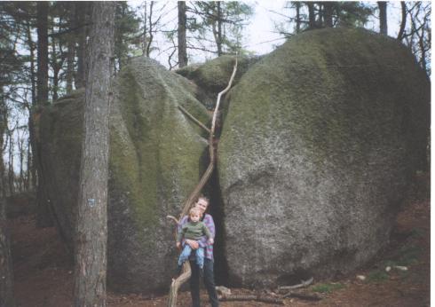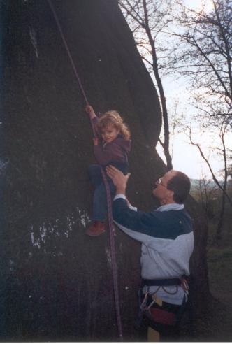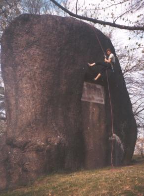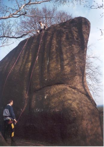 Impozantní útvar. Při první rodinné vycházce loni na podzim jsem měl jen lehké lezečky, které jsem na špičkách úplně rozerval. Kolmý nástup, který se posléze v rajbasech v některých místech uklání, k postupu slouží miniaturní kristalky na stupy i na nehťáky ostré jako břitvy. Sedmimetrovou homoli, o níž se prý v literatuře mylně polemizuje, zda to jsou menhiry (nejsou - je to přírodní vodou vymletý žulový útvar), již lezci zušlechtili. Ve stěnách je několik nýtů, na vrcholku je jistící stanoviště a vrcholová knížka.