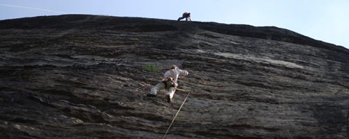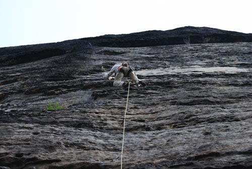 Když už je skoro dole zjišťujeme, že když Anakondu krájel ze 150 metrového lana, měl radši udělat 100 + 50 metrů a né 90 + 60 m, protože na zem ještě kus chybí. Zůstává na patestu asi  7 metrů nad zemí. Dá se tam pohodlně stát, sedět a třeba i ležet. Běžím se vyčůrat, navazuji se, obouvám se a jdu na to. Já na patest lezu postupně, jak Ládík z patestu slézá dolů. Komedie hadr!!! Posadím se na patest, Ládík svléká boty bere mě do grigri a já konečně můžu zdolávat co jsem si ráno prosadil. Ruším první jištění a mažu k prvnímu kruhu. Jde to celkem dobře a tak lezu ke druhému.