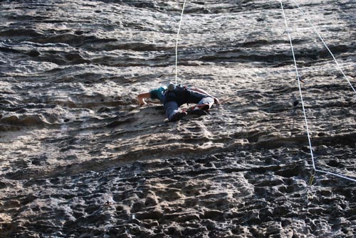 Ládík dává lano k nástupu a je jasno, jdeme na to. Vybral cestu s názvem „kruh za kruhem VIIIb“. To, že je to VIIIb se dozvídám až večer z telefonátu, … pochopíte později. Je to hezká cesta po velkých chytech, dáme si jí na rozpinkání a pak se uvidí. Koukám nahoru a vidím ve stěně jak o prvního kruhu odlézá postarší muž. Kluk co ho zespoda jistí, nám prozrazuje, že je to jeho tatík a je mu úctyhodných 60 let. Mazal nahoru celkem svižně, takže nebylo celkem  moc času na lelkování. Za chvilku byl u třetího kruhu. Malej odpočinek a maže dál! Ládík se navazuje a jde na to. Už to někdy lezl, prý 15 let zurick asi tak. Jde to celkem pohodově 1.,2.,3,.,4...kruh, taky nějakej borhák tam je, a tak furt dál.