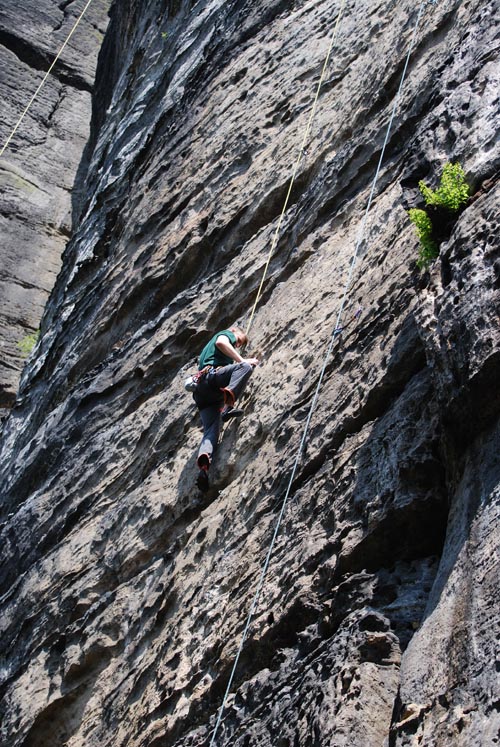 Pomalu mizí ve stěně. Já zalomej krk jak furt vejrám nahoru. Tatík od vedle už slaňuje. Musí na dvě svázaný lana, protože je to fakt dálka a lehce do převisu. Konečně se poznáváme, postarší muž, menší postavy  a rozhodně nezapře minulost aktivního sportovce. Říkám si, je dobrej v tom věku, kéž by mi to taky ve stáří taky tak lezlo.