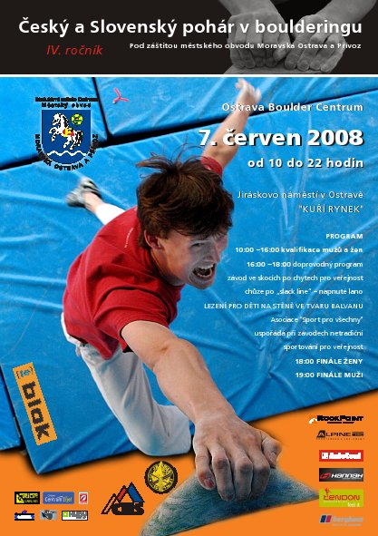 Nenechte si také ujít jedinečný zážitek s naším novým komentátorem - Paskalem (kdo ho zná, tak ví...). Zase letos proběhne závod ve skocích a vítěz si opět může doskočit pro lano "Tendon". Během celého sobotního dne bude náměstí protínat "slack line" a pro ratolesti je připraven balvan od Toma Pilky. Program pro diváky v pauze mezi kvalifikací a finálem zajistí asociace "Sport pro všechny" ukázkami netradičních sportů (sama nevím, co to přesně bude..:))Na vítěze čekají kromě finančních, také bohaté věcné ceny od firem Hannah, Berghaus, Triop, Tendon....
