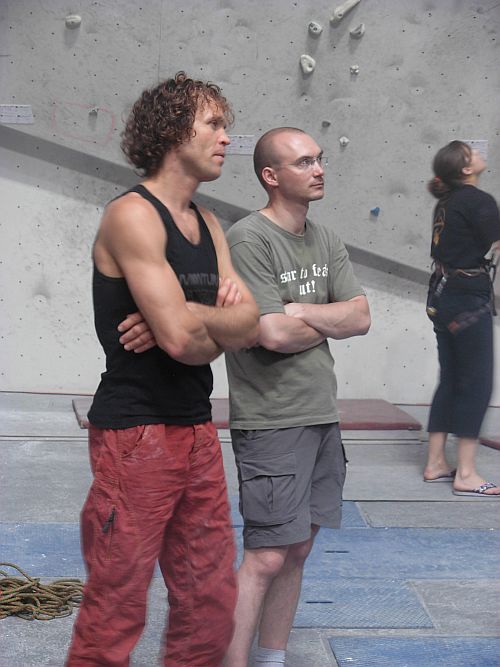 Hlavní stavitel závodních cest ukrajinská lezecká legenda Jevgenij Krivošejcev a organizátor závodu Dan Kadlec