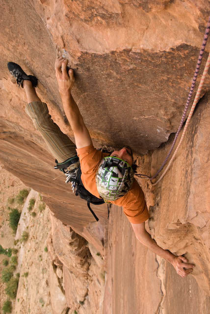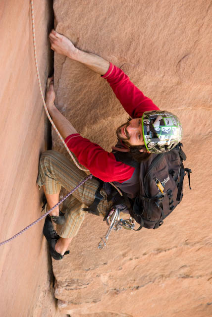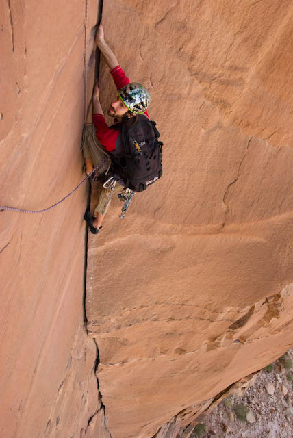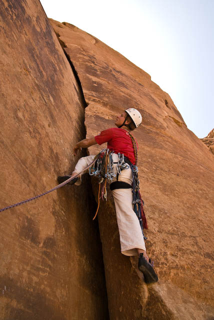 Odpoledne lezeme starou známou Flight of Fancy (5+, 5-, 6a, 6b, 5+, 5+), na East Dome of Jebel Rum, což jsou hezké spáry a skvostný prstový sokolíček a večer ještě 1. délku cesty Mano Negra, flek za 7a+ prasíme, zbytek čistě, velká paráda po vlastním s pár bh. Večer ukládáme naše opocené trvanlivé salámy do ledničky v Rest house.