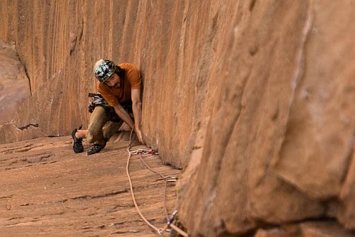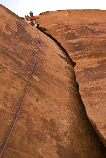 The Beauty je super: parádní sokolíček, pak kus širočiny a položené prstovky a nakonec šavlovitá široká spára. Průvodce doporučuje vzít do širočiny největšího frienda a posouvat ho během lezení před sebou, my ho ovšem nemáme, tak nakonec zakládám frienda do skuliny asi v 6m a zbytek sólo. Se spálenými rypáčky se vracíme do kempu, snad zítra Viktor nezapomene opalovací krém.