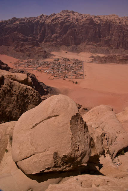 Výhled na vesničku Wadi Rum a nejvyšší Jebel Rum