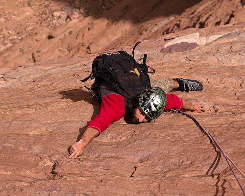 2 . den 2 hodiny vyprošťujeme lano a pak lezem šest délek cesty Aqauarius na E. Dome of Jebel Rum (6a, 6b, 5+, 6a, 5+, 5), jsou tu dva pěkné morálovější traverzy, pár hezkých kroků po lištách a zajímavý hlemzací podhodnocený spárožlábek (prý 5+, pche). Po slanění 45min klopýtáme sutí, snad zítra Viktor nezapomene druhou čelovku.