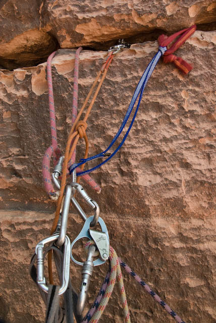 3 . den jdeme na The Beauty (5+, 6a, 5+, 5, 5+, 4+, 200m 2-3) na Jebel um Ejil. Samotný více než hodinový přístup je hodnotný a dobrodružný, bloudění systémem údolíček a průchodů, 6m trojkovým komínem s baťohem na zádech, nakonec traverz v rajbáku 30m nad zemí, kus slézt, 2m seskočit a už jsme ve správném kaňonu.