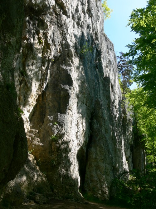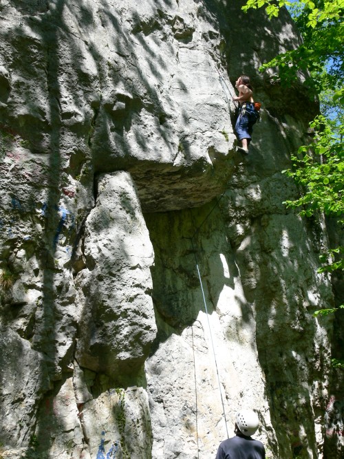 Než jsme odjížděli, představovala jsem si Basler Juru jako severní Frankenjuru. Přeci Jura jako Jura. Takže jsem čekala zavlhlé, místy zelené, dírkaté kvaky v lese, které mám opravdu ráda. Hned v první oblasti Falkenfluh (256cest) mě proto udivila výška cest - poctivých 25m. Pohledem do průvodce jsme zjistili, že v řadě oblastí jsou cesty i přes 30m. Místo dírek nás nepříjemně překvapily spárky všech velikostí a směrů, kromě toho horizontálního.