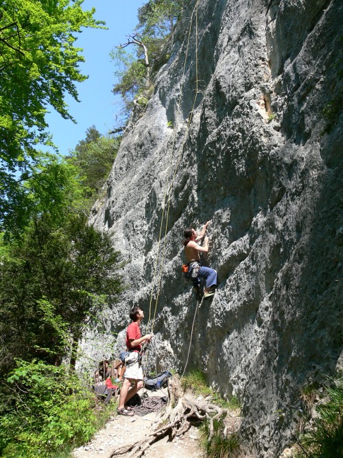 Lezení se tedy ukázalo jako velmi technické a cesty dost poctivé. A po pár cestách kluci zhodnotili, že místní klasifikace je tvrdá a to speciálně v lehkých cestách (od 6c-7a už seděla více). Poctivá klasifikace se pak potvrdila i další den v oblasti Schartenfluh (120cest).