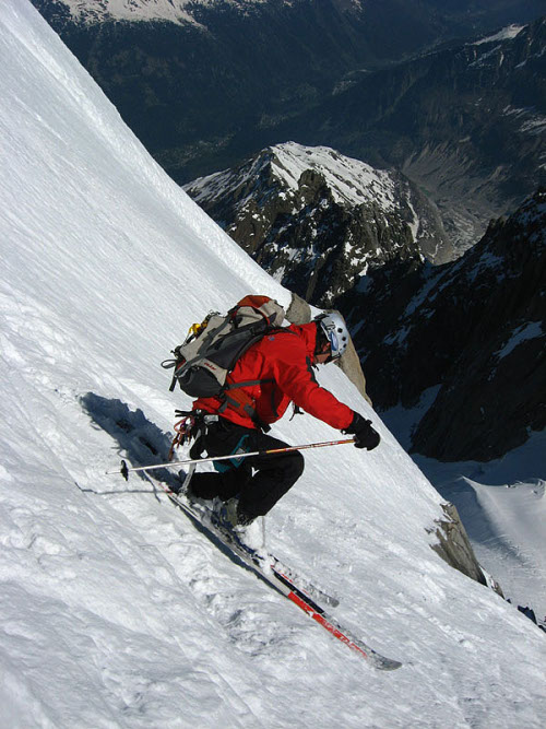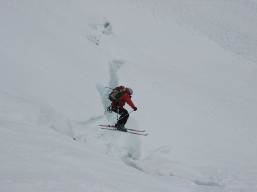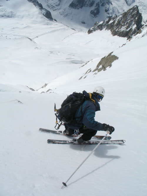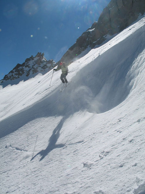 Ještě zbývá jeden den krásného počasí, necháváme se vytáhnout první lanovkou na Grand Montents a odtud poklidným tempem pod široký kuloár s opravdu monstrózní okrajovou trhlinou, dosahující v některých místech až patnáctimetrové výšky. V sedle se moc nezdržujeme, chceme jet co nejrychleji dolů, neboť slunce začíná pomalu opouštět severovýchodní svah a brzy se začne tvořit krusta. Nikde není led, tak nás čeká první pořádné lyžování, které, zejména dole, komplikuje přemrzlý firn bizarních útvarů a vln od slunce a lavin.