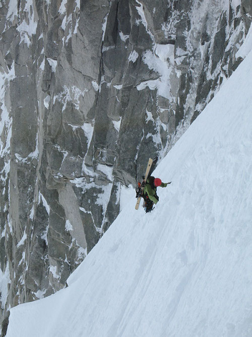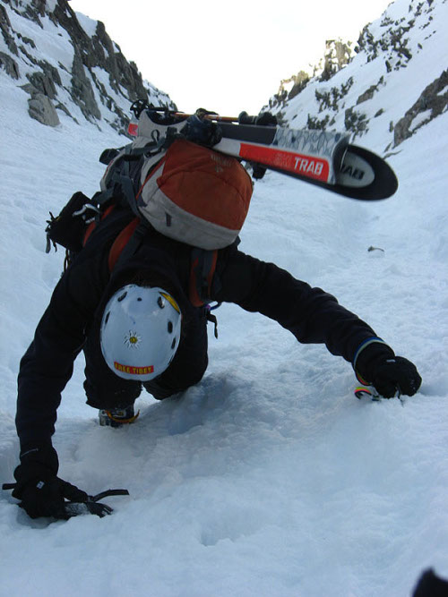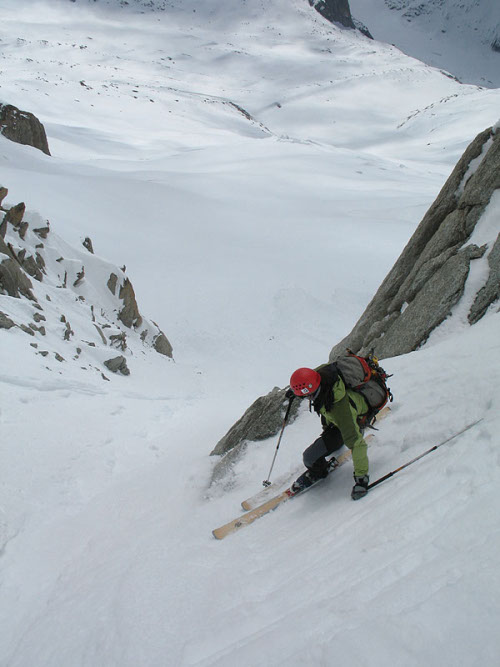 Iva s Romanem odjíždějí, další den již pouze ve dvou volíme úzký kuloár, do kterého nastupujeme poučeni z předešlého dne o několik hodin později. I tak ale v sedle pod vrcholem čekáme další tři hodiny na rozměknutí sněhu. Horních deset metrů jistíme lanem kvůli vyčnívající skále. Jízda je opepřena metr a půl hlubokým lavinovým kanálkem, který půlí už tak úzký kuloár na dvě části. Sklonu míry 45° si proto moc neužijeme, po krajích je to čistě za padesát. Je dost teplo, tak se snažíme co nejrychleji dostat dolů mimo dosah případných lavin. Rozbředlý sníh velmi dobře drží, starosti činí pouze dvojité překonávání té proklaté díry, ze které se s lyžemi prakticky nedá vymotat na povrch.