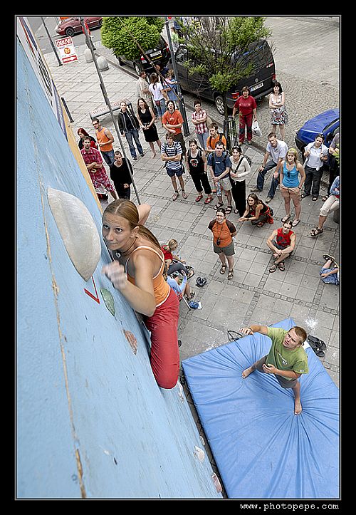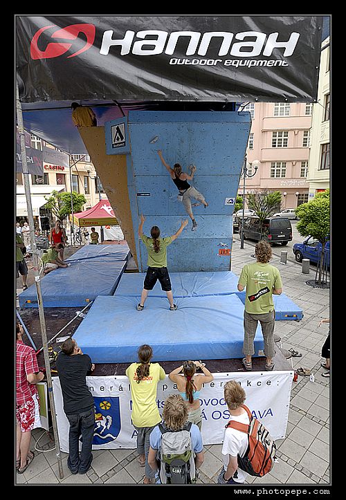 • Výše zmíněná slovenská finálová smršť měla pochopitelně i českou účast – Jan Chvála (který mimochodem suverénním způsobem opět v závodě ve skocích doskočil nejdál a odnesl si lano Tendon) si skvěle vedl v kvalifikaci (4. topy), ve finále však pro čechy vybojoval jen  6.místo, Petis Kalman postupoval z výborného čtvrtého a po zdlouhavých zdravotních problémech naprosto překvapil 10. místem, Penovi – momentálně 8céčkově nadupanému borcovi  ( na podzim  Strelovod 8c) to prostě asi někde “šklhlo”, Fojťas sice přijel, ale nějaký bacil mu umožnil být pouze zaníceným divákem. Lucka Hrozová šlapala slovenkám na paty, což na bednu bohužel nestačilo, Katka Balcarová – Pavlovičová po návratu z mateřské pauzy odjela spokojená s pocitem, že to příště bude ještě lepší a Kača Šindelka- výborně silově připravená  tam nerozbalila to, co měla. Před ní se krásně umístila Míša Drlíková, která se vrátila ze skal, takže je každému jasné, že musí být vylezená, ale pro bouldering nepoužitelná (na domácích skalách (ve Francii) už sundává 8a a a+ naprosto nudným způsobem).