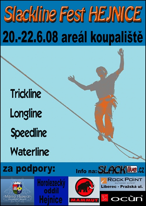 O vejkendu 20. - 22. 6. se uskuteční v areálu koupaliště v Hejnicích  slackline fest - jako součást několika dalších festů, pod názvem Slackline Tour 2008.
