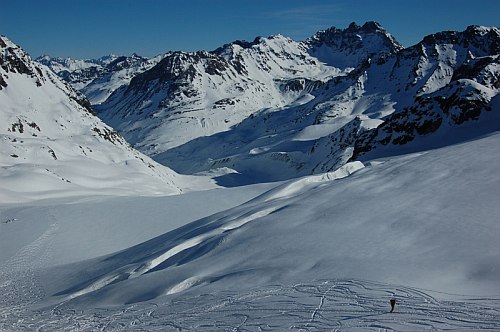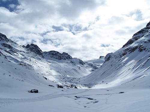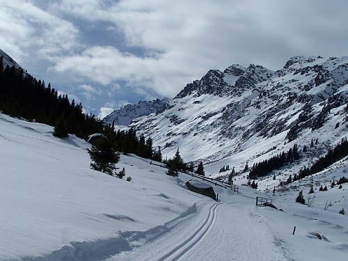 Pozornost jsme nejprve upřeli na údolí Jamtal. Údolí táhnoucí se z Galtüru jižním směrem. Táhnoucím se jako smrad. Vrcholky kopců po obou stranách jsou o tisíc metrů výše. Cesta na chatu byla projetá rolbou. Jen v tom horku jsem měl nohy ve skeletech zanedlouho uvařené a na ploskách jsem si vypěstoval pěkné puchýře. Tiše jsem záviděl běžkařům, kteří se kolem nás zlehka prohnali.