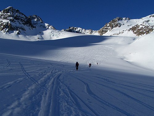 V ranním mrazivém stínu jsme sklouzli od chaty na dno údolí Jamtal, kde nás po několika stovkách metrů čekal nenápadný nástup úzkým splazem na samotný ledovec Jamtalferner. Stopa krásně vedla a poměrně rychle jsme se nenavázáni pod východním úbočím Salzgrat a Ochsenkopf dostali do sedýlka Obere Ochsenscharte 2.970 m. Poslední metry ledovce byly příkřejší, ale jinak šlo o ledovcovou procházku. Příjemný skitúring. Možnost navázání na lano si musí probrat v hlavě každý sám. Horští vůdci s klienty, kteří mířili přímo přes zlomy ledovce na Jamspitze, je měli na laně. Podobně bych se zachoval i já v případě strmějších a členitějších ledovců pod Gamsspitze a Chalauspitze. Vždy to je o znalosti místních ledovců a aktuálnímu stavu sněhové pokrývky.