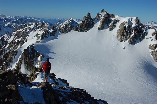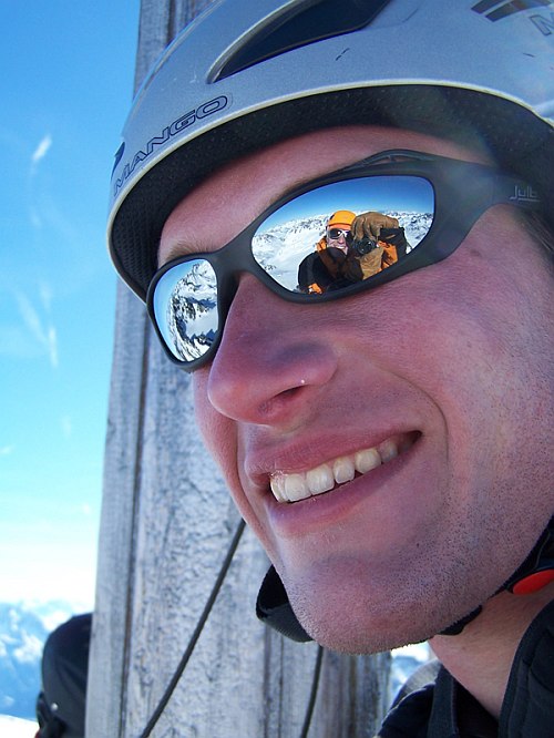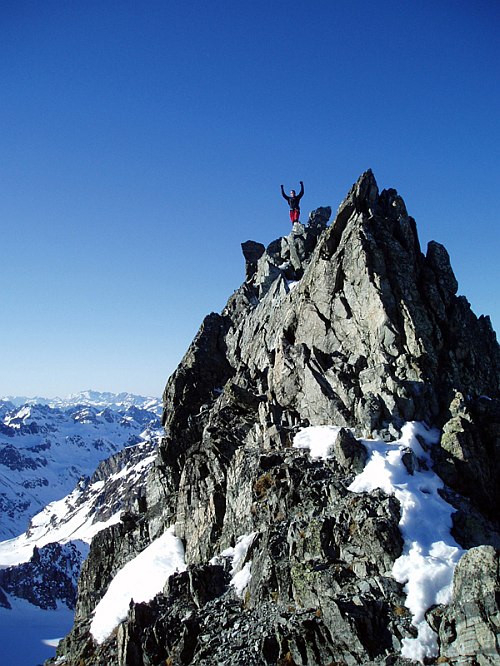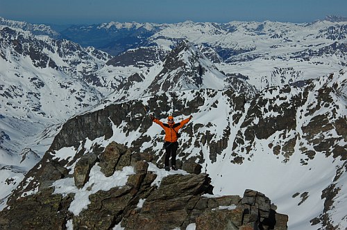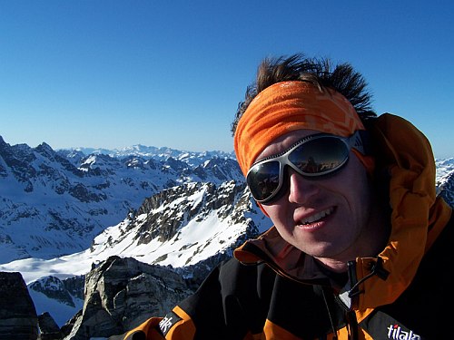 Výstup na Vordere Jamspitze odsud strmým vysněženým žlabem vypadal značně jednodušeji a vrchol sám působí nicotně oproti pohledu ze severu, kde se tváří jako nedostupný skalní zub. Žlab je krátký, ale o to více strmější. V závěru 45°. S mohutnou vrstvou mokrého sněhu natátého v poledním ostrém slunci tak nepůsobil nikterak důvěryhodně. Po jednom jsme jej vylezli a jaké bylo naše překvapení, když nás od vrcholu dělil hřebínek ostrý jako břitva s velmi slušnou expozicí. O dost větší jak na Dreiländerspitze. Následoval chutný traverz ve skeletech (bez lana) a seděli jsme se na špičatém bombónu, který jsme hypnotizovali, aby se s námi nesesypal dolů na ledovec.