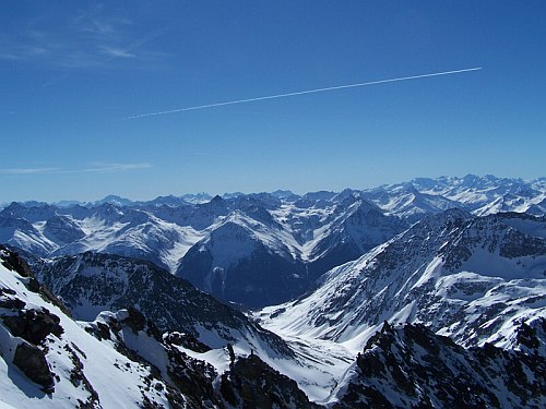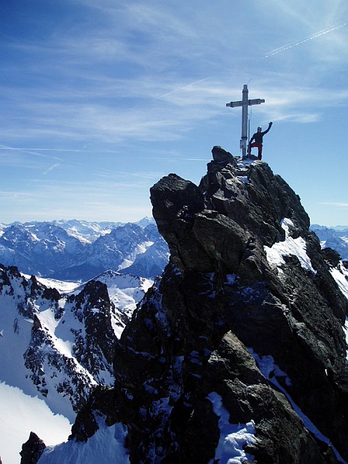 V sedle Obere Ochsenscharte se nám dostalo prvních opravdových výhledů na Silvrettu. Rozeklané vrcholy obklopené ledovci. Dále následoval ještě příkřejší několikasetmetrový podvrcholový svah (do 35°), který nás přivedl na západní skalnatý hřeben. Dle podmínek nazujete železa a vytáhnete cepín nebo jej necháte na batohu, podobně i s lanem. My jsme se přiklonili k první možnosti. Závěrečné metry ostrého hřebene k vrcholovému kříži jsou velmi exponované a vyžadují jistý krok. Na vrcholu není prostor pro větší siesty. Dáte zápis do vrcholové knihy, pokocháte se rozhledy na Ötztalské Alpy na východě, Ortler na jihovýchodě, Berninu jižně, Albula Alpen na jihozápad, Rätikon na západě a Verwall na severu. Stejně Vás asi nejvíce přitáhne dominantní Piz Buin 3.312 m, nejvyšší hora Silvretty Piz Linard 3.411 m a samozřejmě Silvrettahorn 3.244 m.