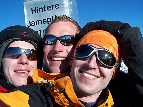 Sjezd podvrholového svahu pro ubitý starý rozježděný sníh byl průměrný. V sedle jsme hodinu nacvičovali skok z převěje. Přímo ze skalní ostruhy s rozcestníkem to nedal nikdo z nás. Minimálně 10 metrů s nepříliš ideálním dopadem už zavánělo vším, hlavně ne příjemným dopadem. Najednou Standa zavelel, že musíme ještě na tamten vrchol. A přitom ukazoval na Vordere Jamspitze 3.178 m. Po vydatném zahřátí našich stehen se dále odhodlala pokračovat jen trojice z nás.