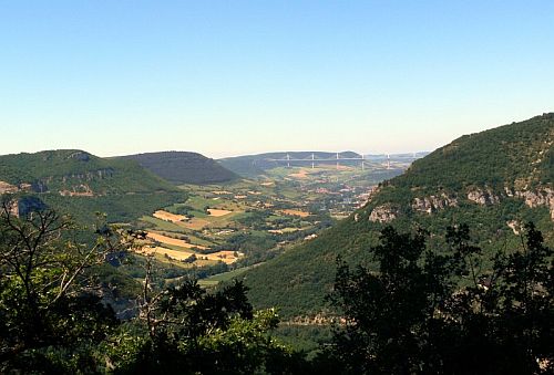 Údolí řeky La Durbie, v pozadí nový div světa - most v Millau, pohled ze skal