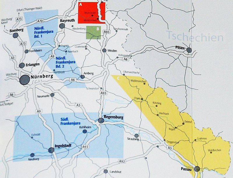 Popisované oblasti, žlutě je Bayerischer Wald, zeleně Steinawald, a červeně Fichtelgebirge. Modé oblasti jsou již jiné průvodce Panica. (hi res)