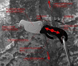 Princip zakládání lana do jistítka, jistítko je pomocí černé pojistky otevřené